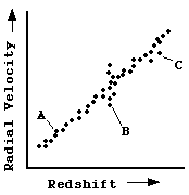 8) When we plot the radial velocities of galaxies against their redshifts, we come up with a graph like the one shown below.