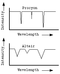10) Below are parts of two stellar spectra (both containing the same pattern of Carbon absorption lines), one for Altair and one for Procyon. Both stars have the same size, rotation speed and orientation, and the star Altair is at rest relative to the Earth (it is not moving toward us or away from us).