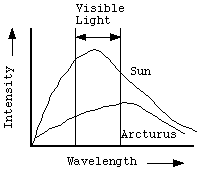12) Below is the spectrum of Arcturus, compared to that of our Sun, which peaks in the middle of the visible region (yellow) of the spectrum as seen below.