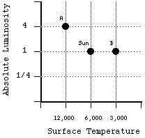4) On the H-R diagram below the positions of two stars, A and B, are plotted relative to the location of the Sun. For each of the two stars, state whether it is larger, smaller or the same size as the Sun and justify your answer mathematically or in words. You donıt need to write down an exact value for the size, just indicate how you came to your answer.