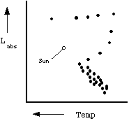 8) A certain globular cluster is observed closely so that the properties of its stars can be plotted on an H-R diagram. The resulting data looks like the graph below, with the Sunıs location on the diagram shown for reference only (the Sun is not a part of this globular cluster). Are the stars in this cluster likely younger, older or the same age as the Sun? Justify your answer.